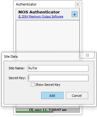 6. Запускаем программу и создаём новую учётную запись (нажимаем на + в верхнем правом углу). Вписываем название сайта (в нашем случае RuTor), а ниже вписываем наш мастер-кей, который нам сгенерировала система в шаге 4. (Важно! Время на компе должно быть синхронизировано, иначе программа будет генерировать не валидные коды).