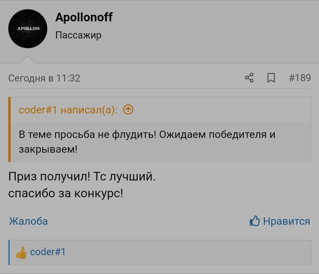 После того, как победитель отписал о получении выигрыша, а на мой взгляд это было довольно сухо и не развëрнуто, учитывая, что человек получил 30к за счёт обычного рандома - 1 счастливчик из +-125 других пользователей судя по лайкам, то у меня появились некоторые вопросы.