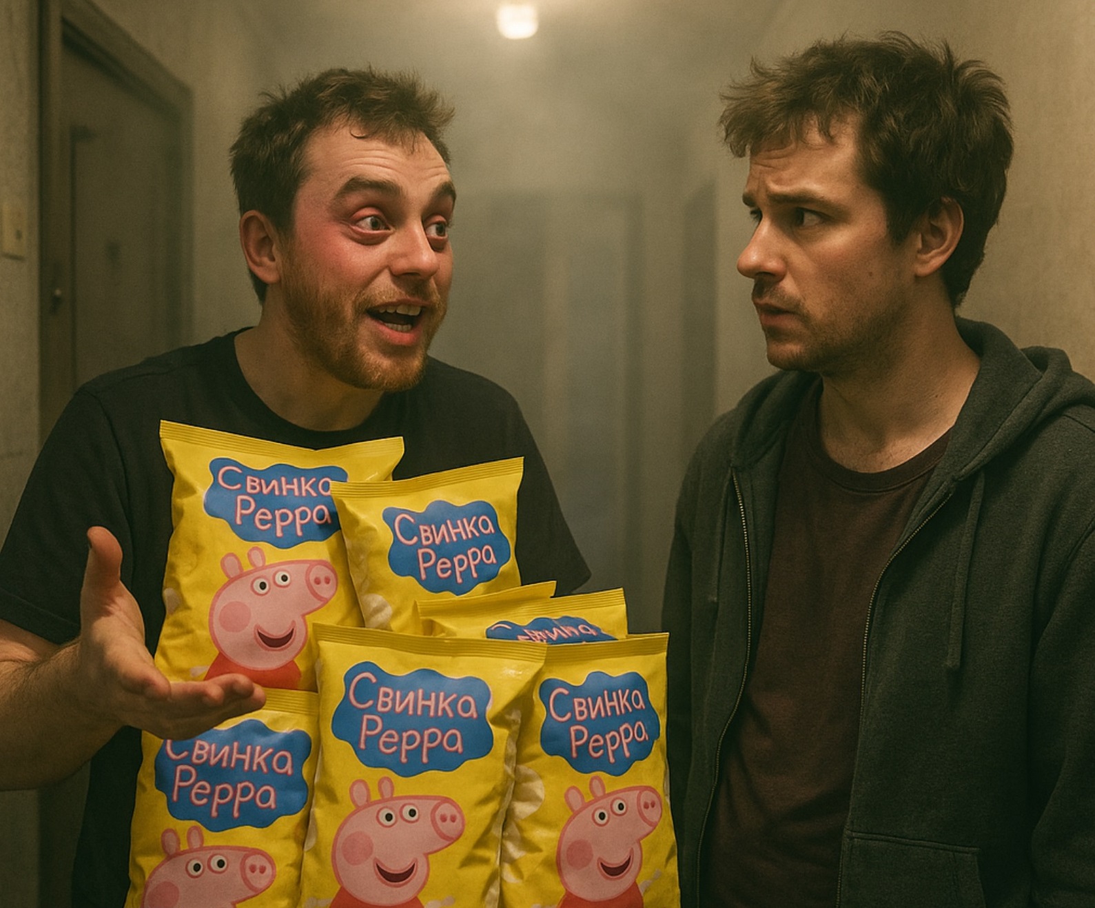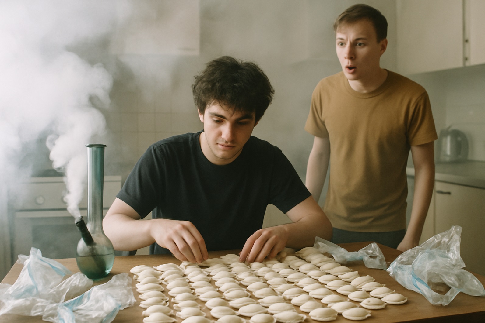 Зайдя в квартиру Серёги, я первым делом выставил вперёд руку и очень осторожно сделал пару маленьких шагов: дым от травы был настолько густой что ориентироваться приходилось исключительно по памяти. Кое – как дойдя по стеночке до кухни я застал Серёгу за самым ебанутым занятием что только можно придумать: доставая из огромной коробки одну за одной пачку вареников с рисунком свиньи (где только взял такие?), он судорожно рвал её, пересчитывал каждый вареник, что-то записывал в тетрадь и складировал в отдельную кучку. Далее раздавался тихий шёпот со словами «пиндосы», «ЦРУ», «Заговор» и всё начиналось по новой.