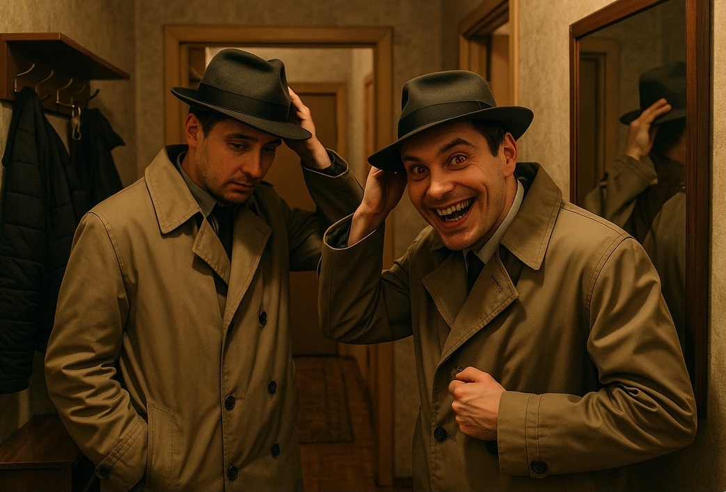 Перед выходом Серёга заставил меня одеть какой-то странны плащ и шляпу (видимо, опасаясь дождя… хз), с важным видом нарядился в такой костюм сам, и мы пошли.