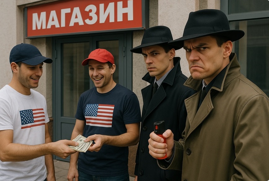 У входа к нам подошли два промоутера, рекламирующие какую – то американскую бытовую химию и попытались всучить два скидочных флаера в виде долларов на приобретение этой самой химии. Промоутеры были явно таджиками и говорили по – русски хоть и неплохо, но с явным акцентом. Опять-таки не знаю, что в этот момент происходило в тотально прокуренной голове Серёги, но услышав предложение промоутеров взять флаеры и купить немного бытовой химии, Серёга зачем – то пшыкнул в них невесть откуда взявшейся у него туалетной водой, вырвал пачку из нескольких флаеров и напевая песню Наутилуса Помпилиуса «Гудбай амерка оооо» пошёл ко входу в магазин. Быстро извинившись перед ошалевшими ребятами я последовал за Серёгой в надежде, что больше он ничего не натворит.