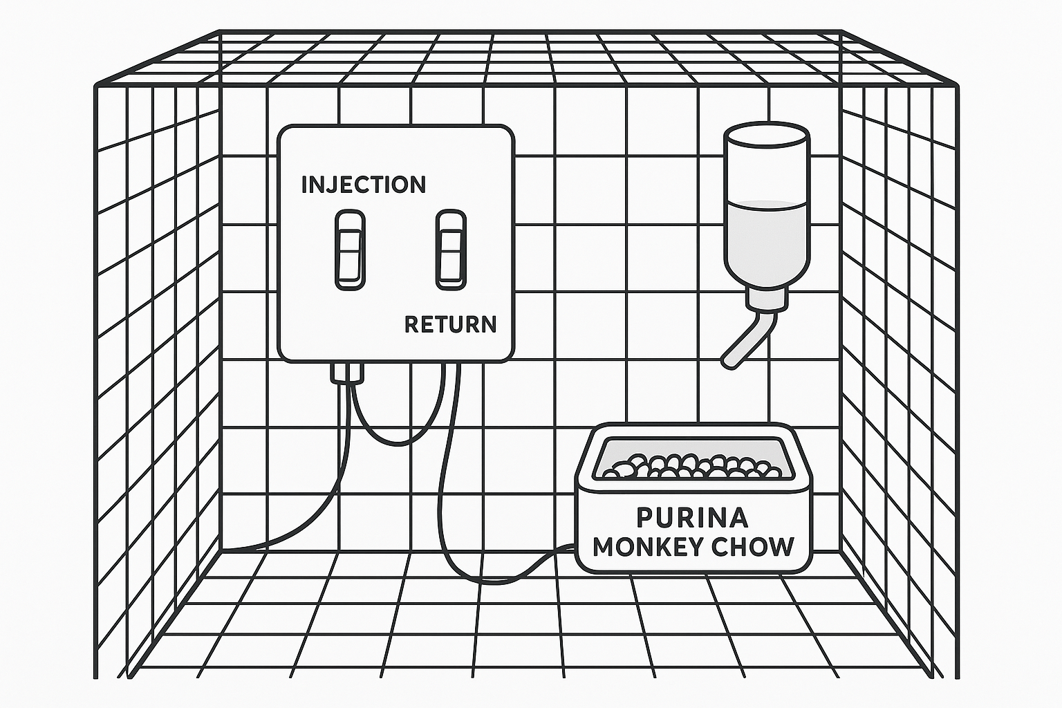 - Животным хирургически устанавливали катетер в яремную вену, соединённый с рычагом в клетке.